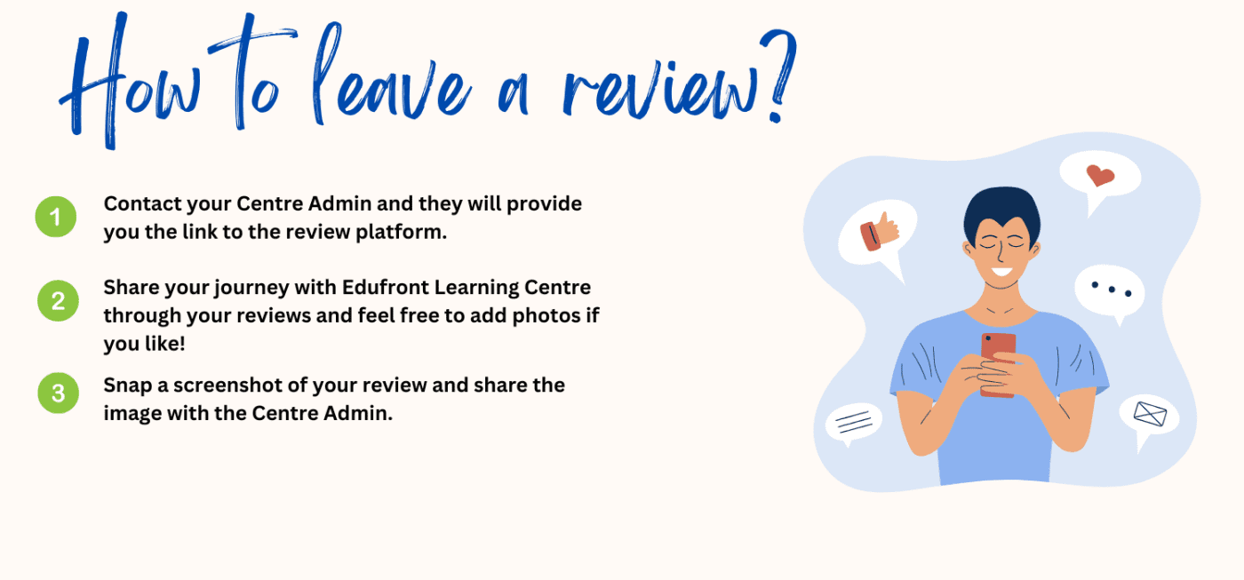 You can contact your Centre Admin via WhatsApp and they will provide you with the review links