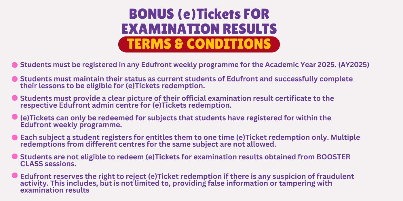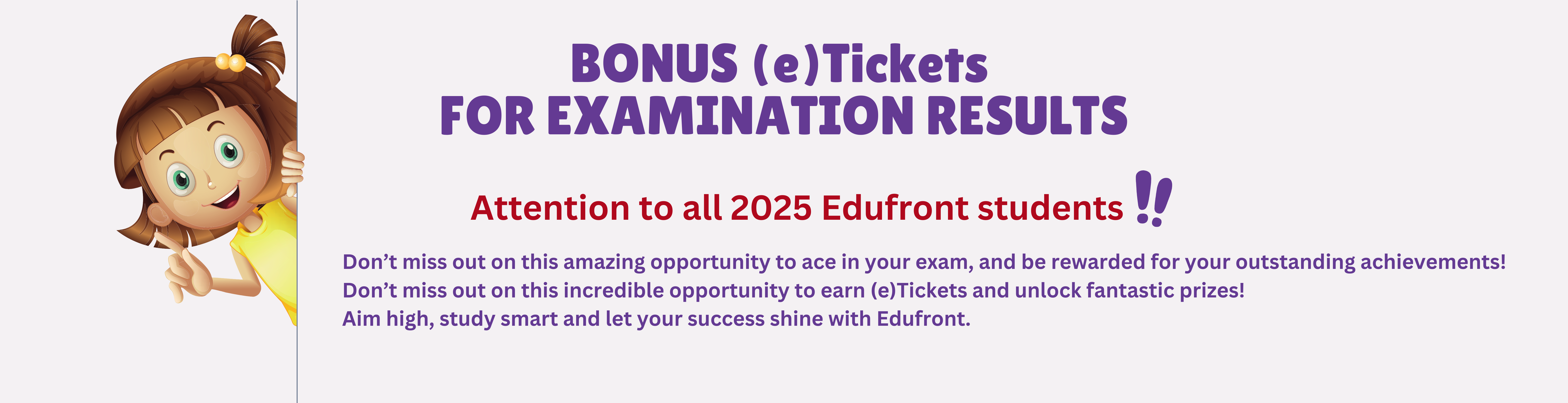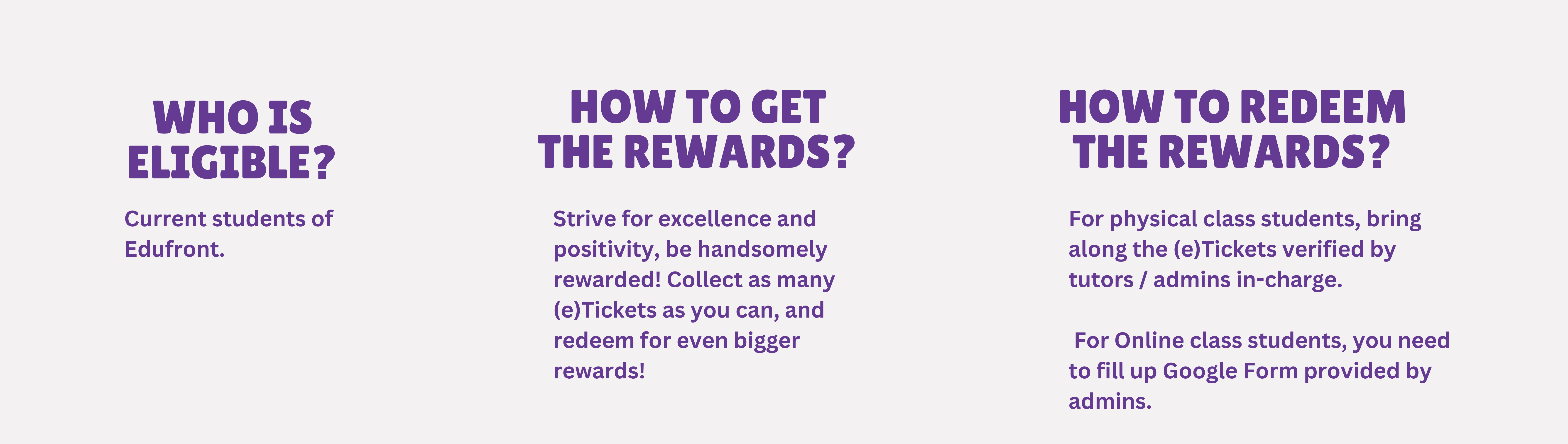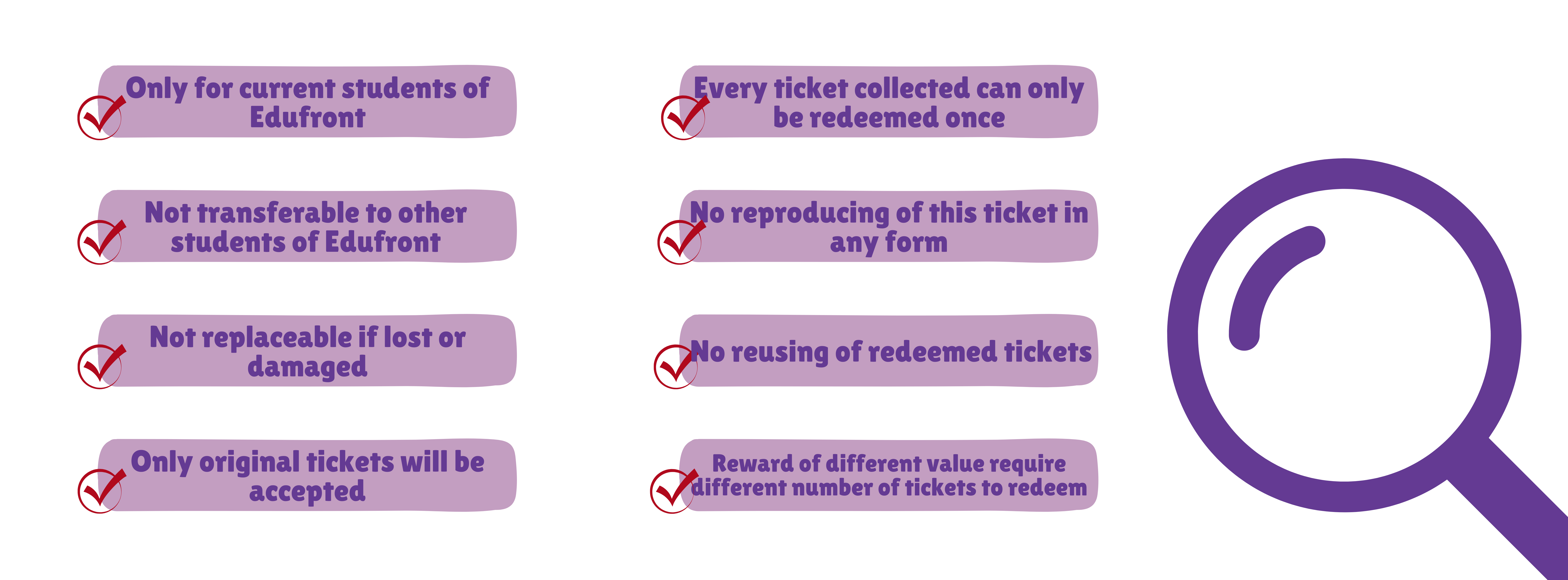 It is a reward system that is applicable to students of Edufront. Current students of Edufront would receive these (e)Tickets to redeem rewards.
