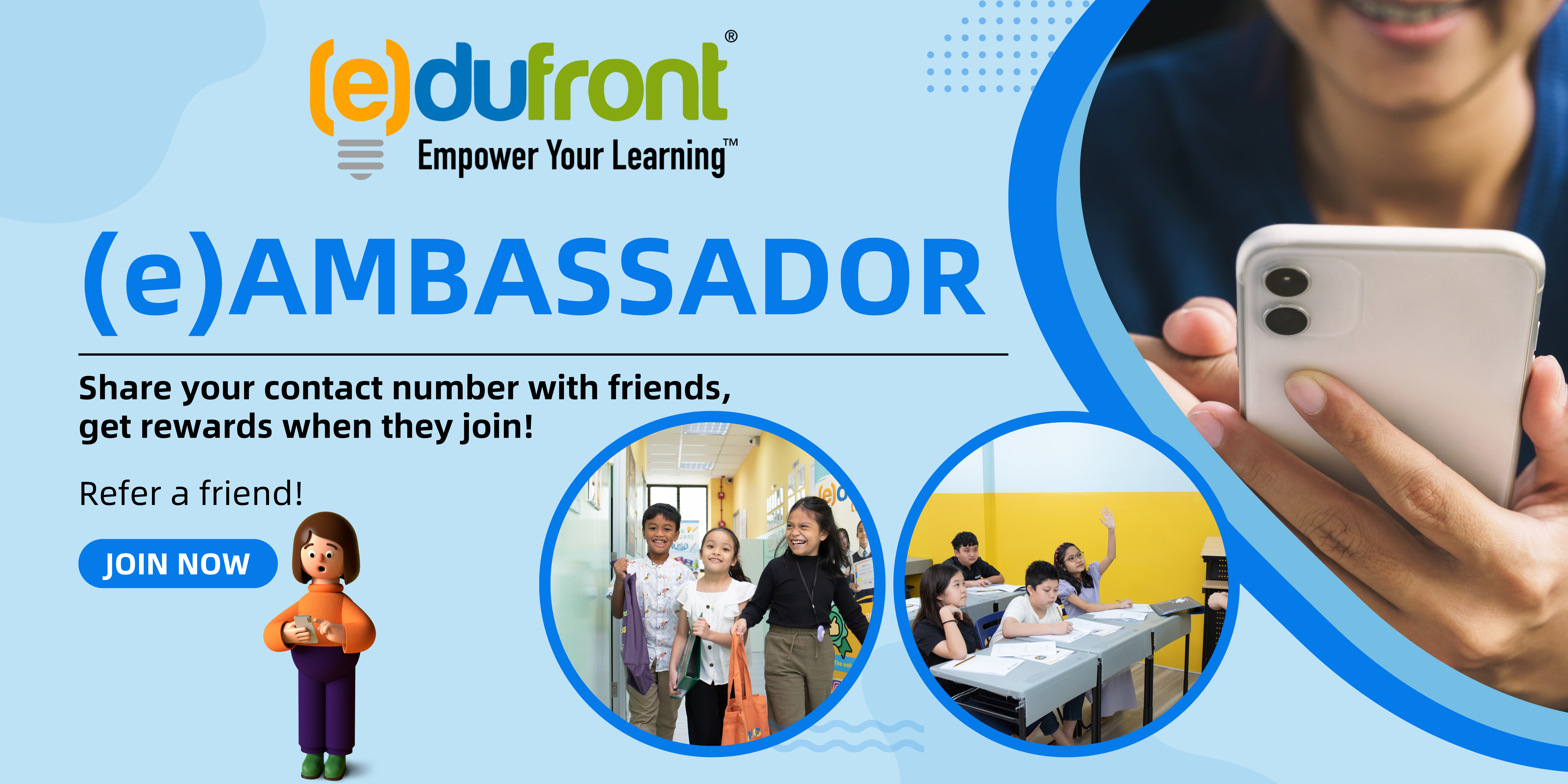 (e)Ambassador is a program designed for public who want to spread the word about Edufront’s educational services. By participating as an (e)Ambassador, you can refer friends to register with our weekly program and earn rewards in return.