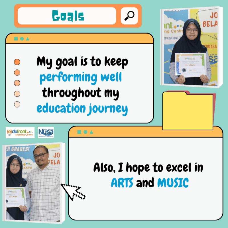 Sora Aisha’s goal is to keep performing well throughout her education journey as well as to excel in Arts and Music.