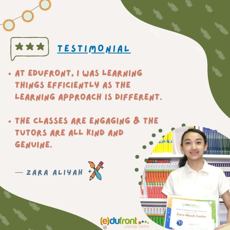 The former North View primary student attended Maths, Science and Malay tuition classes with Edufront. During her time in Edufront, she managed to pick up different learning strategies that have aided her education journey.